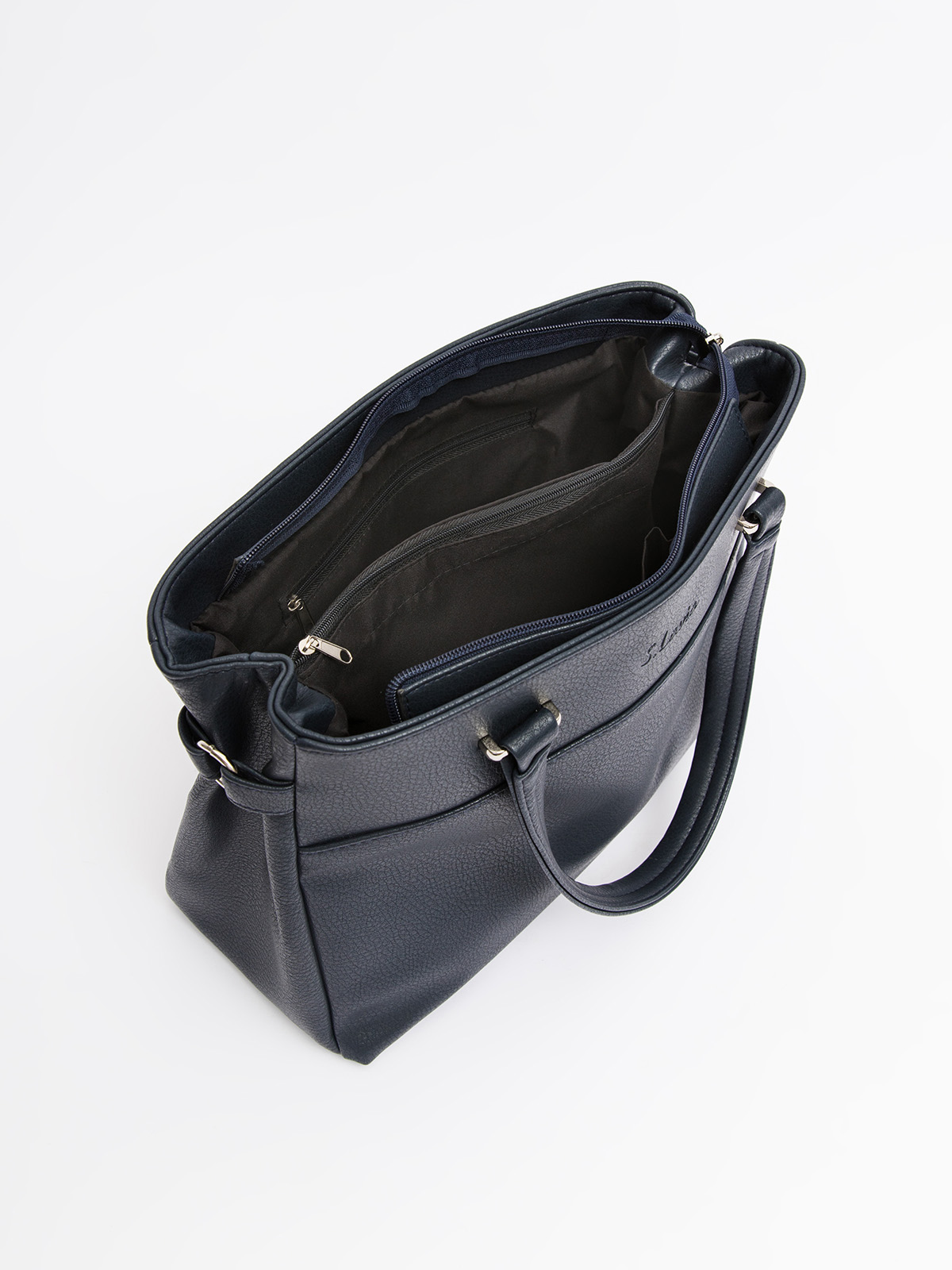 Трапециевидная форма с фигурным подрезом и разрезной передней деталью создает строгий, но выразительный силуэт. Центральный вход на молнии и продуманная внутренняя организация — перегородка с молнией и два стандартных кармана — позволяют удобно разместить все необходимое.