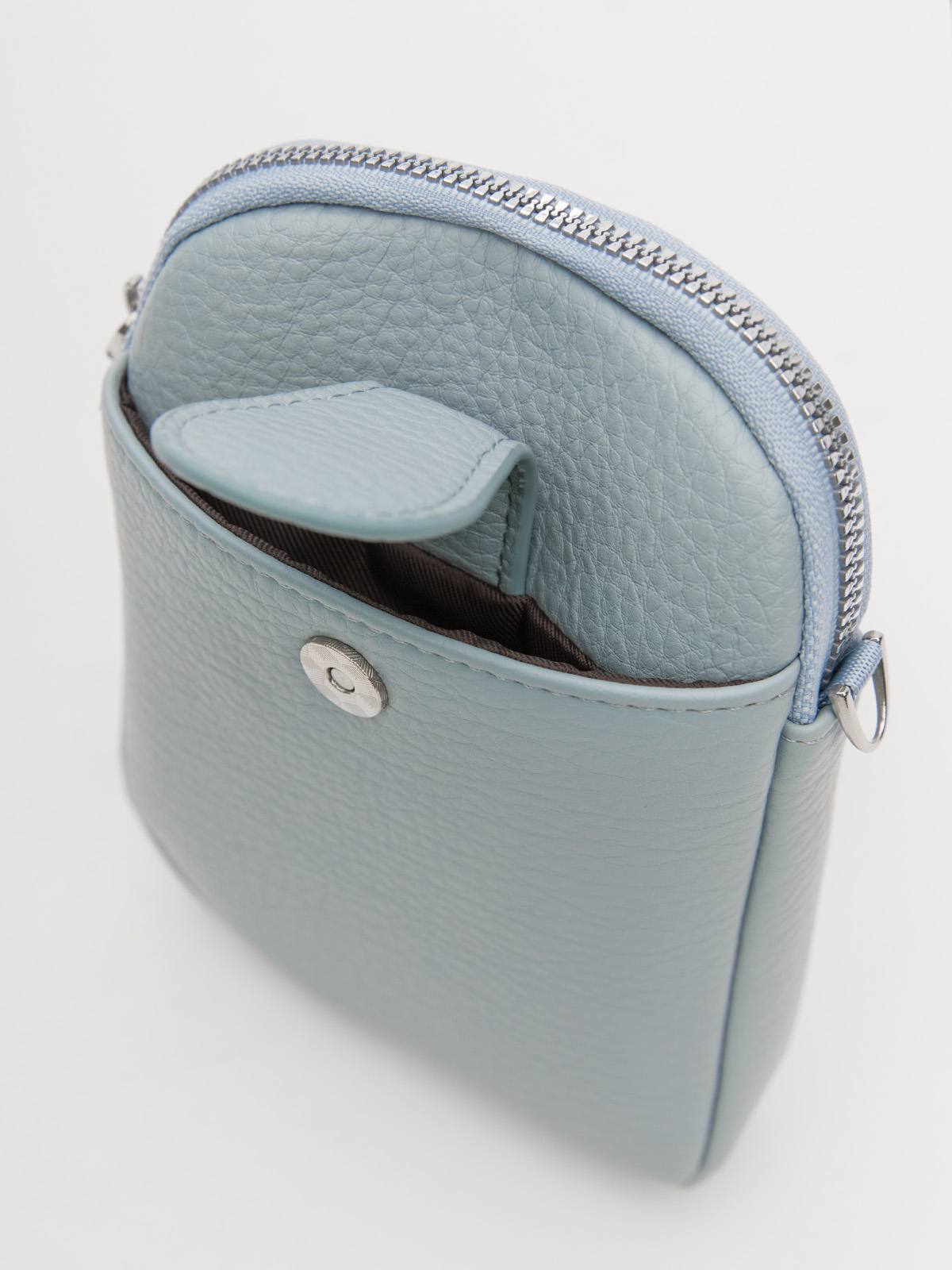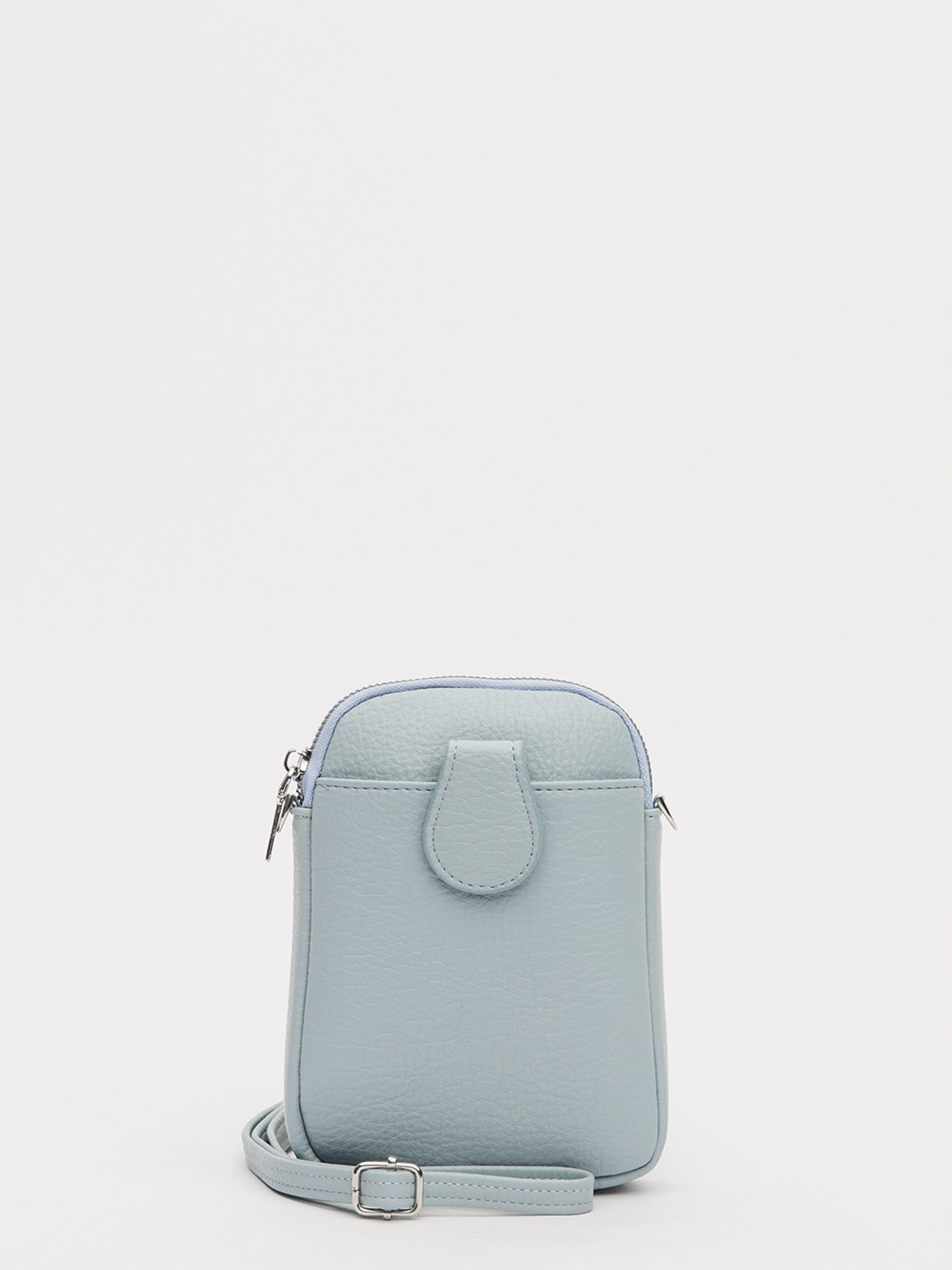 Сумка кросс-боди из винилискожи, вид застежки: на молнии. Имеет одно отделение на молнии, внешний карман под хлястиком на магните, внутренний карман открытый. В комплекте длинный регулируемый ремень. 13х19х3 см.