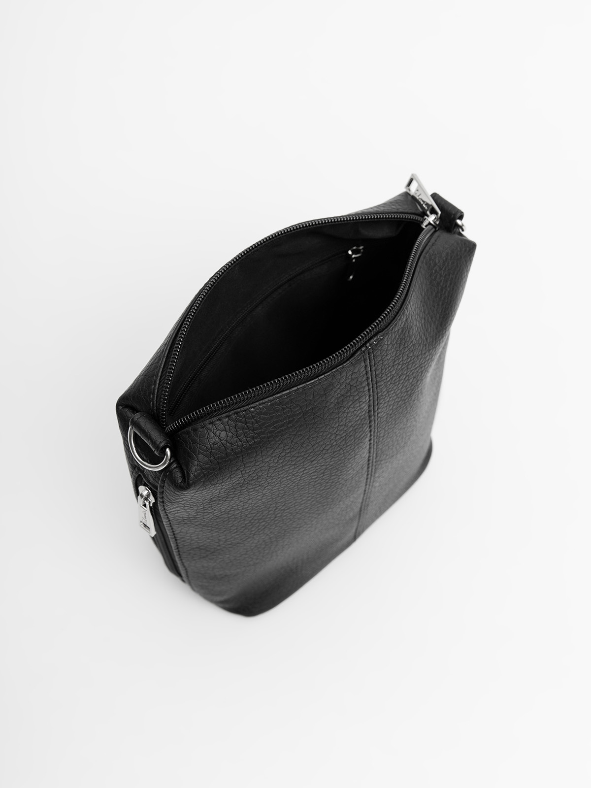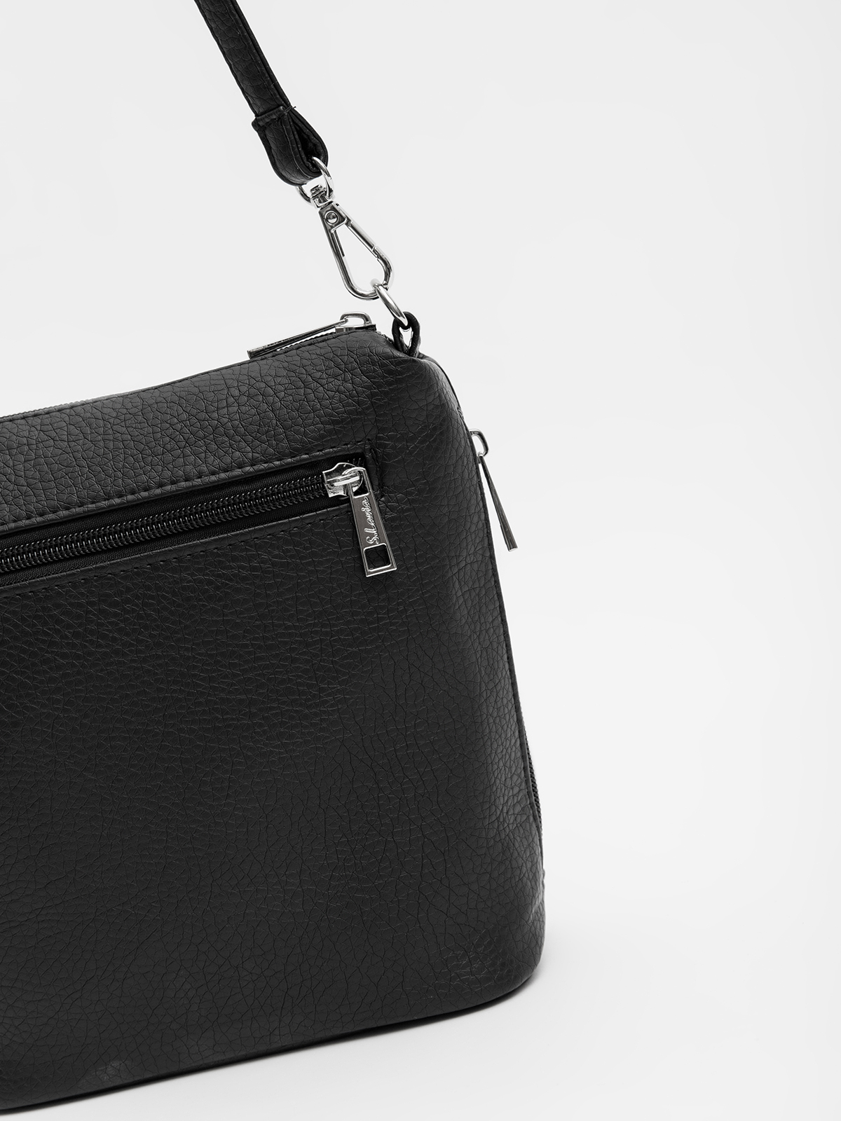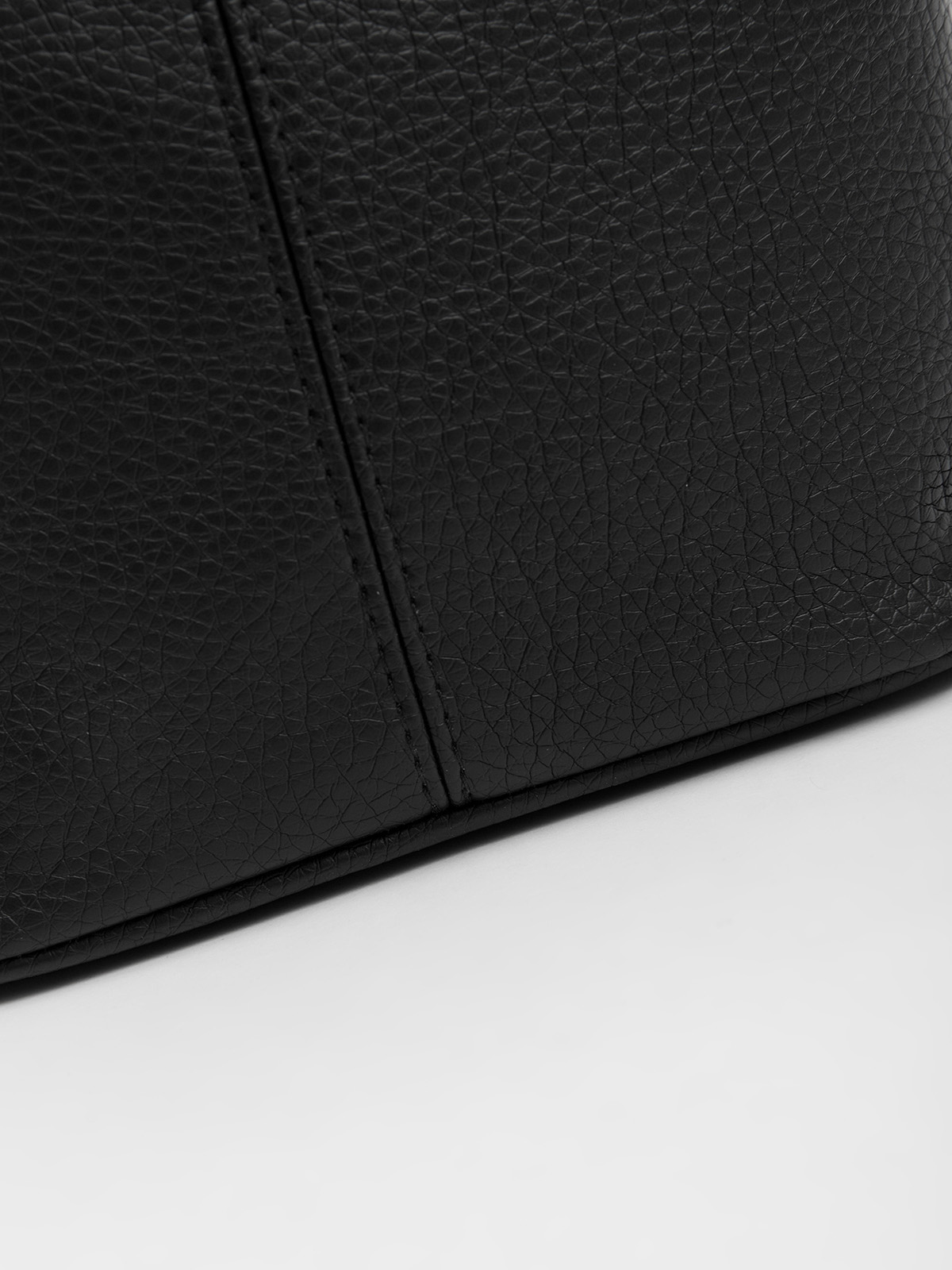 Молнии с металлическими слайдерами. Планшет оснащен ручкой и ремнем, которые крепятся к металлическим кольцам на карабины. Фурнитура серебряного цвета. На язычке молнии есть логотип компании.